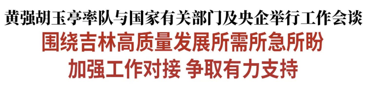 6月23日至24日,省委书记黄强,省委副书记、省长胡玉亭率队,在北京分别与工业和信息化部、自然资源部、国家能源局、中国国家铁路集团有限公司举行工作会谈,向国家有关部门及央企长期以来给予吉林的大力支持表示感谢,围绕吉林高质量发展所需所急所盼,加强工作对接,争取有力支持。工业和信息化部党组书记、部长李乐成,自然资源部党组书记、部长关志鸥,中国国家铁路集团有限公司党组书记、董事长郭竹学和总经理宋修德,国家发展改革委党组成员,国家能源局党组书记、局长王宏志参加有关会谈。