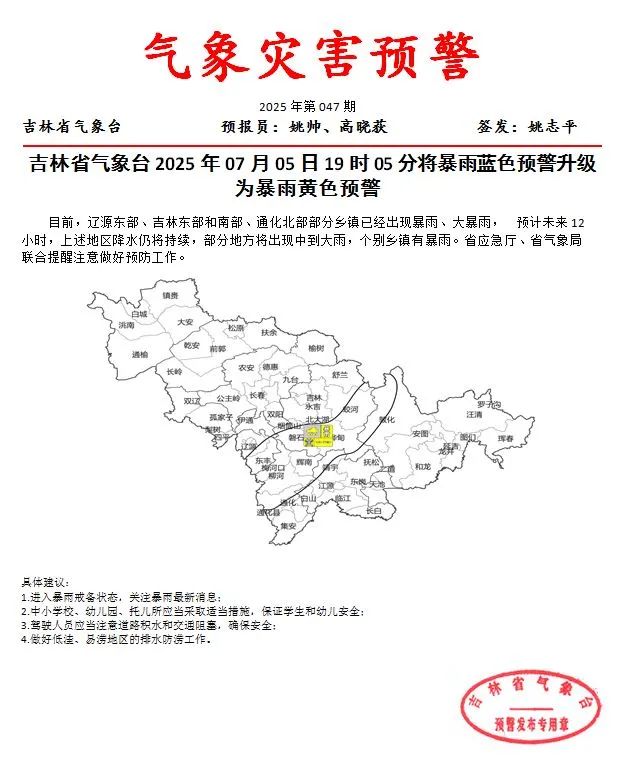 吉林省气象台7月5日19时05分将暴雨蓝色预警升级为暴雨黄色预警:目前,辽源东部、吉林市东部和南部、通化北部部分乡镇已经出现暴雨、大暴雨,预计未来12小时,上述地区降水仍将持续,部分地方将出现中到大雨,个别乡镇有暴雨。省应急厅、省气象局联合提醒注意做好预防工作。