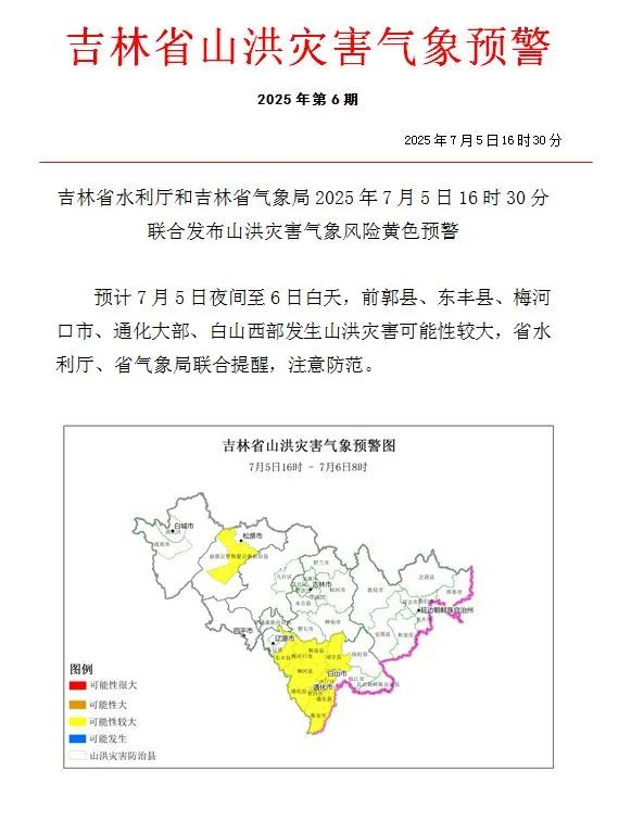 吉林省水利厅和吉林省气象局7月5日16时30分联合发布山洪灾害气象风险黄色预警:预计7月5日夜间至6日白天,前郭县、东丰县、梅河口市、通化大部、白山西部发生山洪灾害可能性较大,省水利厅、省气象局联合提醒,注意防范。