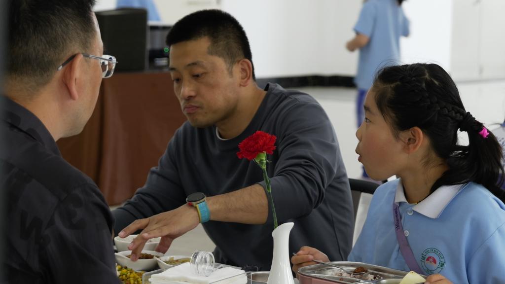 长春市南关区华泽学校的食堂里,学生家长朱伟东正在陪餐。新华社记者 张文嵘 摄