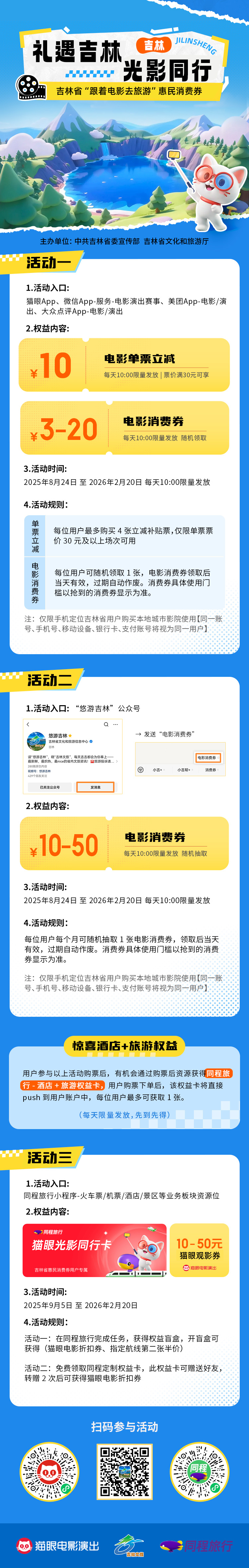 为深入推进文旅融合发展,延展消费链条,持续点燃文化和旅游消费热情,由中共吉林省委宣传部、吉林省文化和旅游厅主办“礼遇吉林·光影同行”——吉林省“跟着电影去旅游”惠民消费券活动,已于2025年8月24日正式启动,持续至2026年2月20日。活动通过构建“观影福利+旅游权益”联动的多元活动矩阵,不仅为本地游客带来观影实惠,更向全国游客递出吉林新名片。