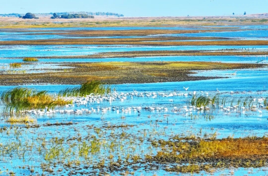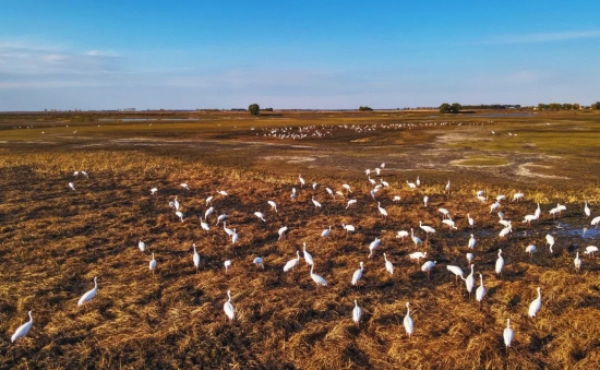 吉林省莫莫格、向海两大国际重要湿地作为鹤类、雁鸭类等候鸟南迁途中的 “黄金补给站”,今秋,再次迎来候鸟迁徙高峰,累计记录候鸟数量超过25万只,上演万鸟翔集的生态盛景。