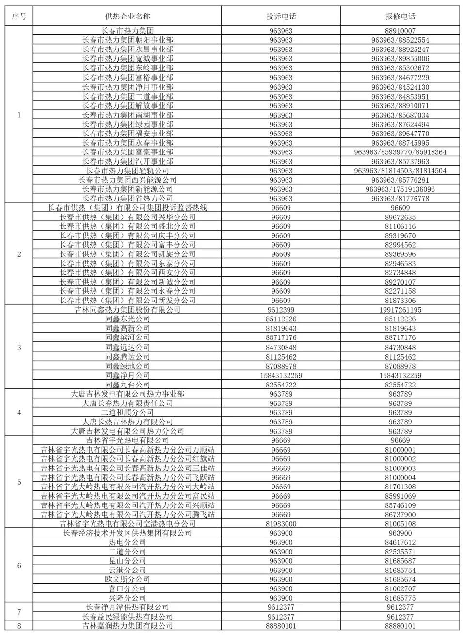 《长春市主城区供热企业投诉+报修电话》