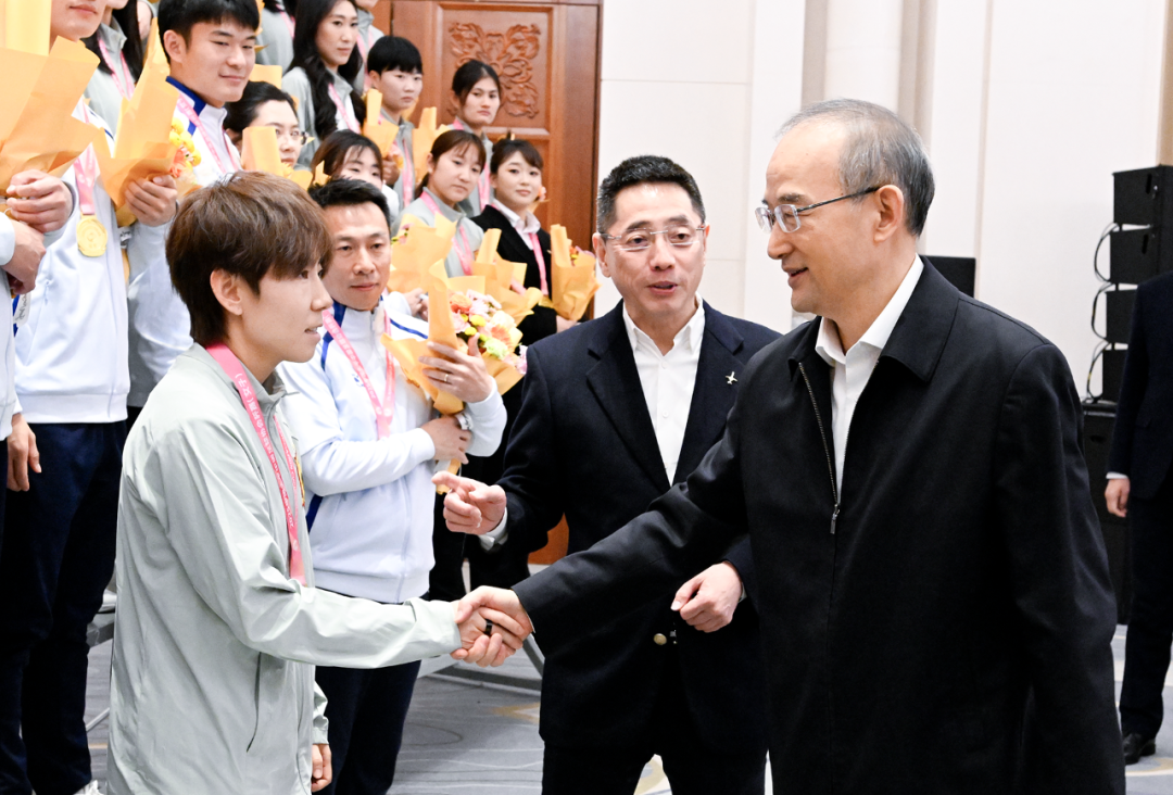 黄强指出,两队夺冠,体现了吉林竞技体育发展水平、体教融合发展成果,展现了吉林健儿昂扬向上的精神、锐不可当的勇气。家乡人民为你们喝彩,为你们骄傲。希望你们继续勇攀高峰,站得更高一些、看得更远一些,把奖杯放进荣誉室,科学训练、刻苦训练、超越自我,努力为国家、为吉林争光争气。做好青少年榜样,引领孩子们参加体育、热爱体育、享受体育,让他们脚下有力、眼中有光、脸上有笑,德智体美劳全面发展。大力弘扬体育精神,把赛场上的顽强作风、必胜信念、团队精神带到工作、学习、生活中,汇聚强大正能量。