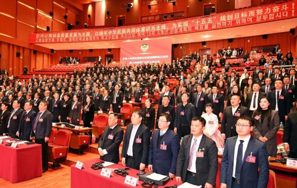 会场气氛庄重而热烈。二楼眺台上,“坚持以推动高质量发展为主题,以铸牢中华民族共同体意识为主线,为实现‘十五五’规划目标而努力奋斗!”的横幅标语格外醒目;主席台上,中国人民政治协商会议会徽悬挂在正中央,十面鲜艳的红旗分列两侧。