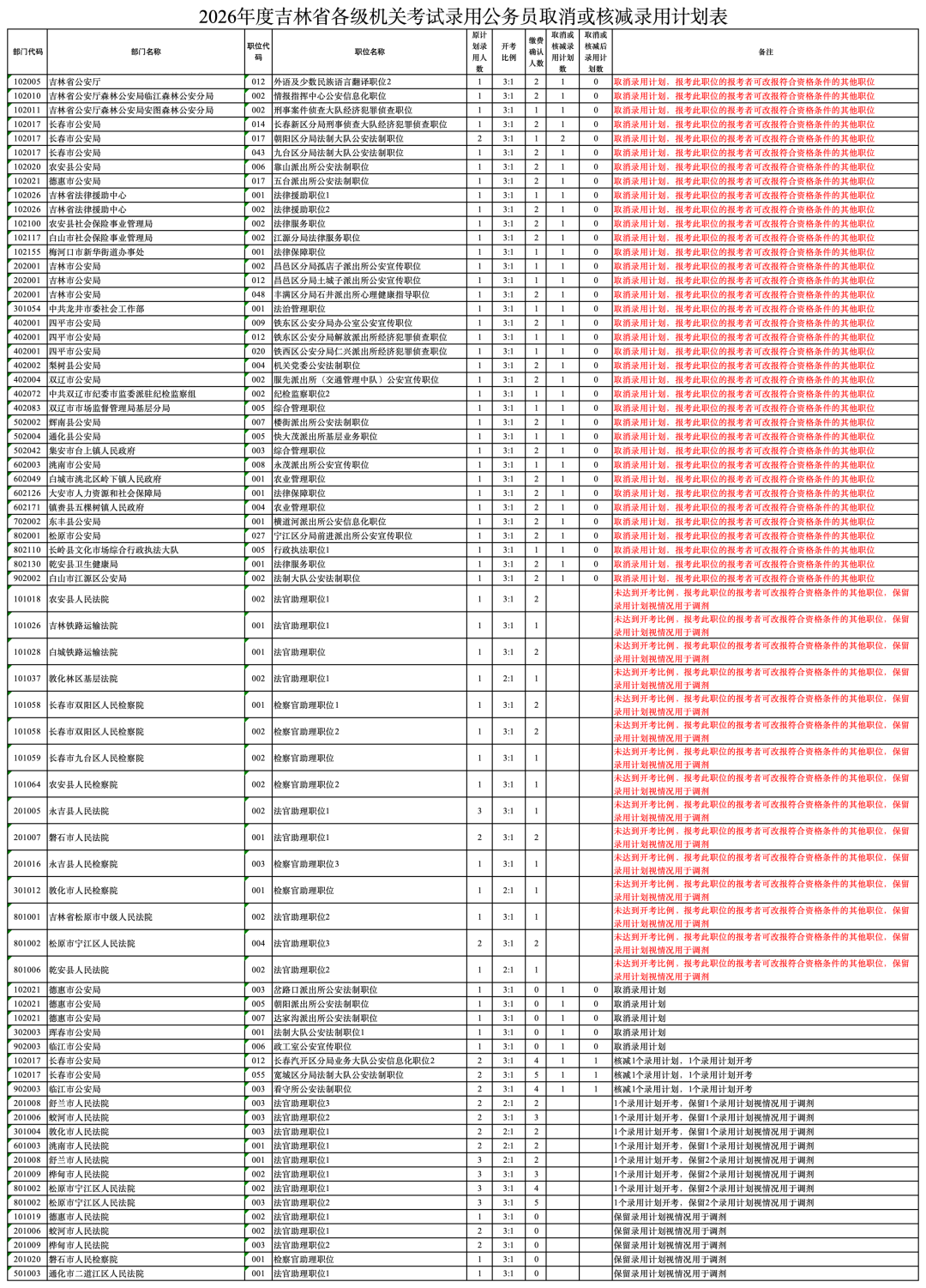 按照《2026年度吉林省各级机关考试录用公务员公告》规定,现对取消或核减职位的录用计划予以公告。