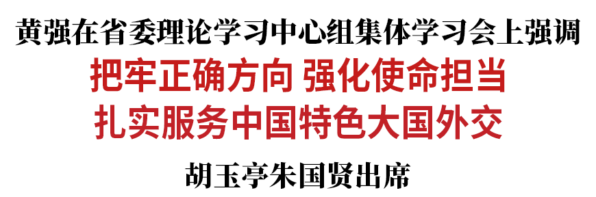 2月9日,省委书记黄强主持召开省委理论学习中心组集体学习会。他强调,要深入学习贯彻习近平外交思想,深化对做好地方外事工作的规律性认识,把牢正确方向,强化使命担当,扎实服务中国特色大国外交。省委副书记、省长胡玉亭,省政协主席朱国贤出席会议。
