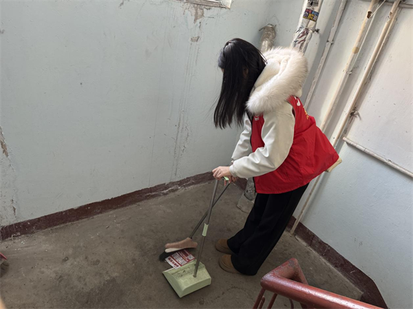 同时,志愿者结合金融行业特色,向居民普及反诈防骗、账户安全、适老化金融服务等常识,用通俗易懂的语言讲解实用知识,守护群众 “钱袋子”,把贴心金融服务送到群众家门口。此外,志愿者还对社区楼道进行集中清扫,清理杂物与垃圾,改善社区公共环境,提升居民居住舒适度。