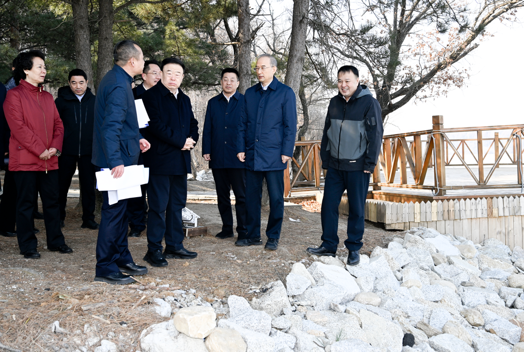 3月21日,省委书记黄强在长春净月潭国家森林公园调研,在森林浴场沿着湖岸实地察看土壤侵蚀、树木倒伏等情况。