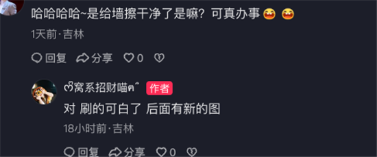 网友的评论很东北:“哈哈哈哈哈~是给墙擦干净了是嘛?可真办事!”随后有人跟帖:“对,刷得可白了,后面有新的图。”