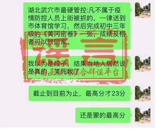 2月16日起,一条“湖北武穴市最严管控:凡不属于疫情防控人员上街被抓的,一律送到市体育馆学习,然后完成初中三年级的《黄冈密卷》一张,成绩及格者可以放回家”的消息在网上热传。