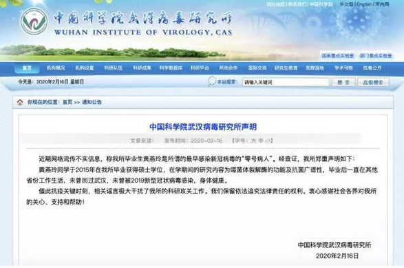 对此,中国科学院武汉病毒研究所发表郑重声明,予以辟谣:黄燕玲同学于2015年在我所毕业获得硕士学位,在学期间的研究内容为噬菌体裂解酶的功能及抗菌广谱性,毕业后一直在其他省份工作生活,未曾回过武汉,未曾被2019新型冠状病毒感染,身体健康。