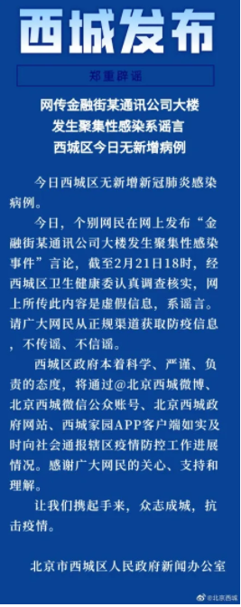 北京西城区政府2月21日发布声明:经西城区卫生健康委调查核实,网传金融街某通讯公司大楼发生聚集性感染系谣言。