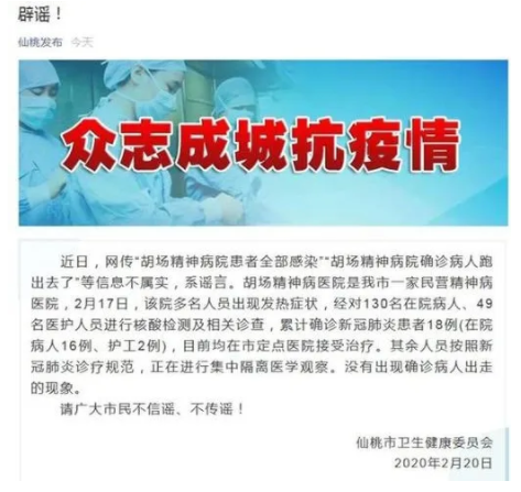 仙桃市委宣传部回应,网传“胡场精神病院患者全部感染”“胡场精神病院确诊病人跑出去了”相关消息系谣言。截至2月17日,累计确诊患者18例,目前均在市定点医院接受治疗。其余人员按照新冠肺炎诊疗规范,在进行集中隔离医学观察。没有出现确诊病人出走的现象。