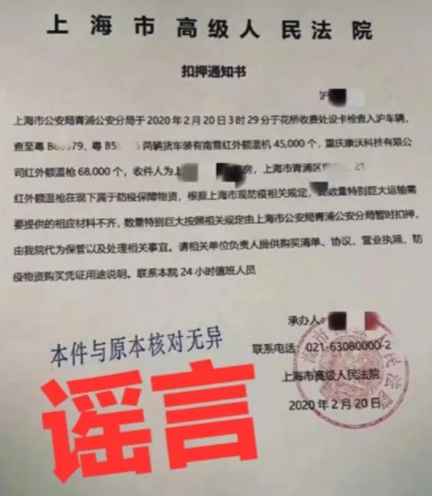 经上海市公安局调查,该信息不实。网传所谓市高级人民法院开具的《扣押通知书》,并声称青浦公安分局扣押了青浦某药房购买的大量红外额温枪等防疫保障物资的文件,系伪造。