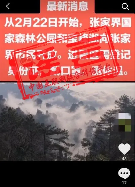 网传“从2月22日开始,张家界国家森林公园和宝峰湖向张家界市民开放”“进景区需登记身份证,戴口罩,测体温”系谣言。目前只推出了“网游张家界”等促进措施,并未对包括本地市民在内的游客开放景区。