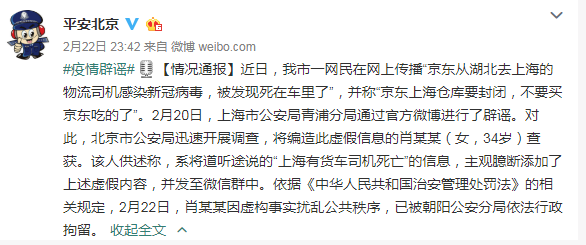 真相:北京市公安局发布通报称,网民肖某某道听途说“上海有货车司机死亡”的消息,编造了“从湖北去上海的物流司机感染新型冠状病毒死亡”的谣言,现已被依法行政拘留。