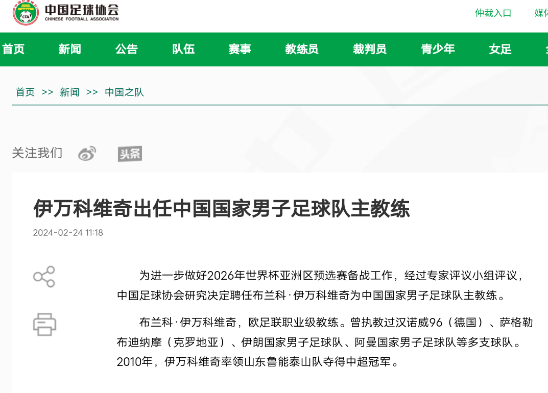 2月24日,中国足协正式官宣,任命伊万科维奇为国足新主帅。