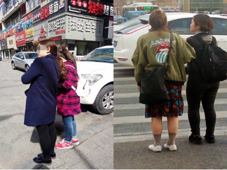 中国姑娘穿着厚大衣(左)VS韩国女孩已经穿上短裙(右)