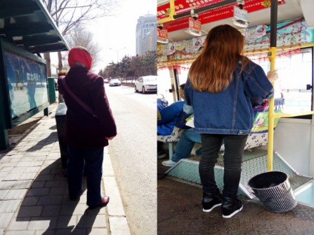 老奶奶怕风用头巾包住头发VS年轻女孩换上牛仔夹克