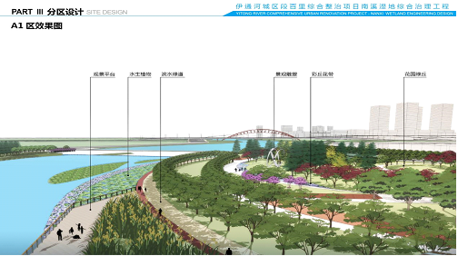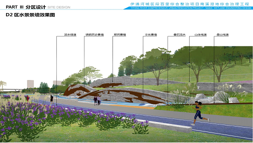同时,在南溪湿地范围内,西部滨河区域被划分为水石径流区、彩丘雕塑区、长白文化区、历史长阶区、城市演绎区、生态栖息区六大分区;东部湿地区域被划分为草坪婚礼区、水塘湿地区、趣味活动区、滨湖休闲区、全民健身区和湿地净化区。