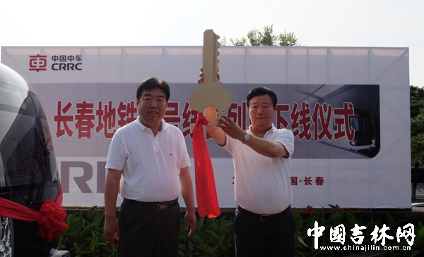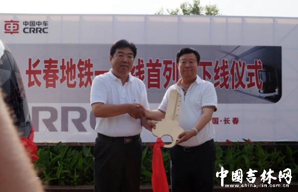 2日下午4点25分,长春市轨道交通集团有限公司董事长王成仁从中车长客股份有限公司董事长王润手中接过了带有象征性的“钥匙”,标志着长春地铁1号线首列车正式下线。