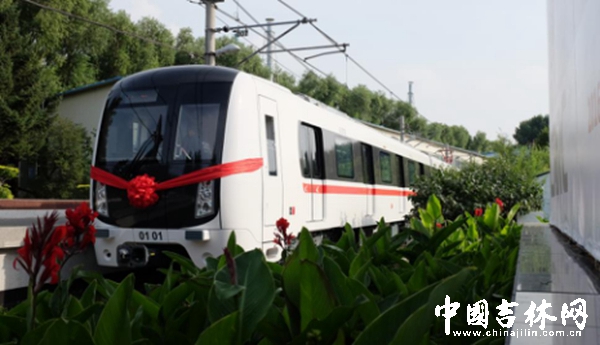 长春地铁1号线首列车,车头戴着大红花,静静地停在铁轨上。红花下,黑色的一组数字:0101,引人注目。