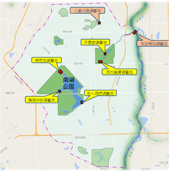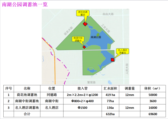 从上图可以看出,在南湖公园范围内,有3座调蓄池,分别为:荷花池调蓄池、南湖中街调蓄池及名人酒店调蓄池。