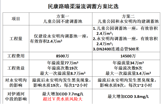 对于民康路暗渠的调蓄池建设,主要集中于儿童公园到底需不需要建调蓄池。为此,设计方案中也给出了比较,经过论证,倾向于儿童公园和永安明沟均需要建调蓄池。