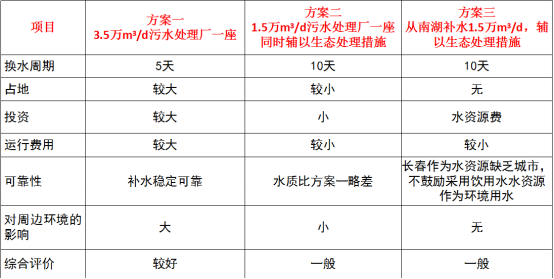 方案二:建设1.5万㎡/d污水处理厂一座,换水周期10天,不满足规范要求,需辅以生态强化处理措施;