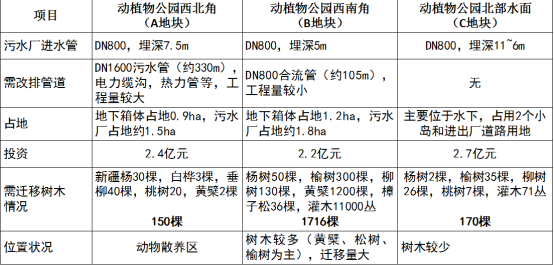 综合比较,推荐A地块,污水厂布置在动植物公园西北角动物散养区。