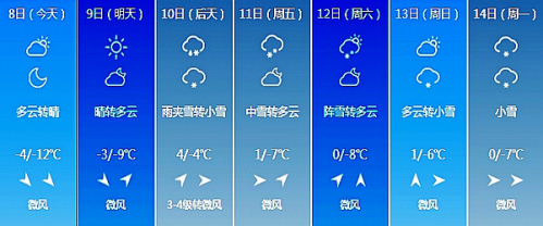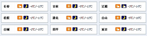 今天白天四平地区最高气温为-1度左右,其它地区为-5~-2度;今天夜间我省大部分地区最低气温为-15~-11度,长春市今天白天最高气温:-4度,今天夜间最低气温:-12度。