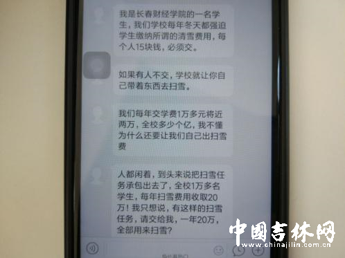 11月10日7时41分,网友“长春热门”发布微博:“【清雪费】网友爆料: 我是长春财经学院的一名学生,我们学校每年冬天都强迫学生缴纳所谓的清雪费用,每个人15块钱,必须交。 如果有人不交,学校就让你自己带着东西去扫雪。”