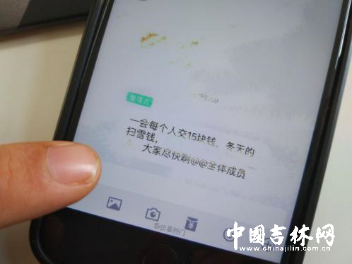 该微博内附两张聊天记录的截屏照片,其中一张照片是一名自称“长春财经学院”的学生聊天记录,主要因学校收取每人15元的扫雪费抒发自己的不满,并且对于“扫雪费”的去向表示怀疑。另一张照片是发布通知管理员的收费的聊天记录,由于照片被PS涂抹,无法判断对方身份,只能看到群管理员身份说:“一会每人交15块钱,冬季的扫雪钱。并@群内所有人。”