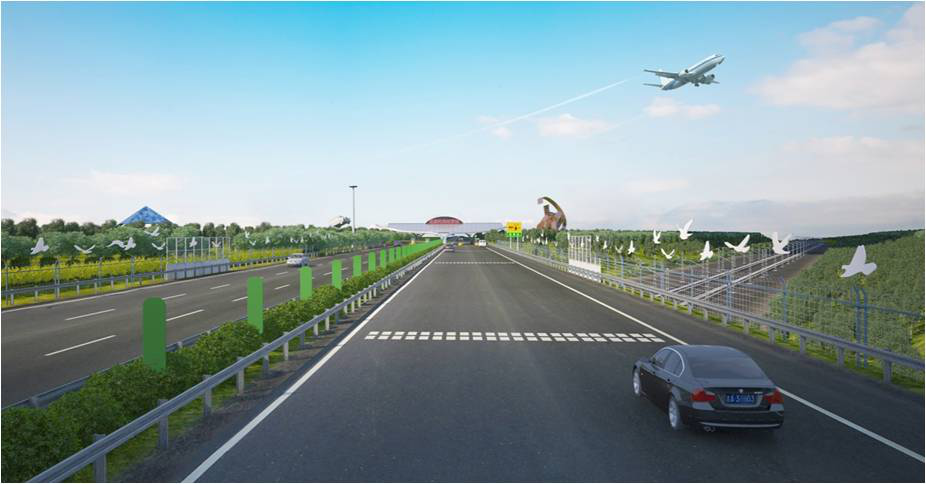 “百鸟迎宾”主题段落西起龙嘉机场收费站,东至机场内匝道,是宾客到达长春的第一印象,宾客在行驶过程中与飞鸟同行,感受到长春人民的热情与活力。