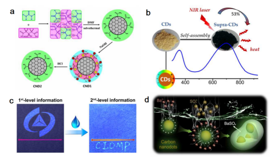 2016年,长春光机所在发光碳点能带调控和功能化应用方面取得多项突出重要进展,研制出发光效率达46%的橙红光碳点(国际最高值)(图a)、具有高效光热转换效率的“超碳点”(图b)、超稳定高效发光的碳点无机复合荧光粉(图d)等成果。上述成果为实现基于碳点的高效发光器件及其在纳米生物医疗中的应用打下基础。