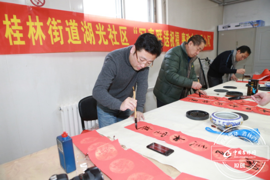 此外,省文联还为社区居民送去了春联、福字、剪纸。张金梁、刘福生、苏亚涛、于全能、赵小宁、马国有等多位书法家现场为社区居民书写春联、"福"字 ,传递新春祝福,增添节日氛围。我省剪纸艺术家孙丽荣为社区居民送去充满年味、寓意吉祥的剪纸作品;民间手工艺人李宏利、李文洁现场辅导村民制作中国结、丝网花等民俗手工艺品。摄影家跟随着志愿者抓拍了一组组为社区居民贴春联、送"福"字的照片。湖光社区的居民孙淑珍今年68岁,作为现场的观众之一,她告诉记者她感到非常幸福。“能和这么多艺术家们在一起近距离接触,真是件非常快乐的事情,以前都只能在电视上看见他们,我还向书法家们要了五个‘福’字,寓意是五福临门。”孙淑珍说。