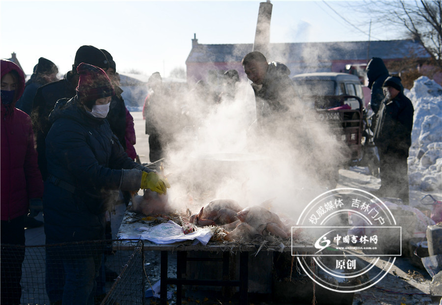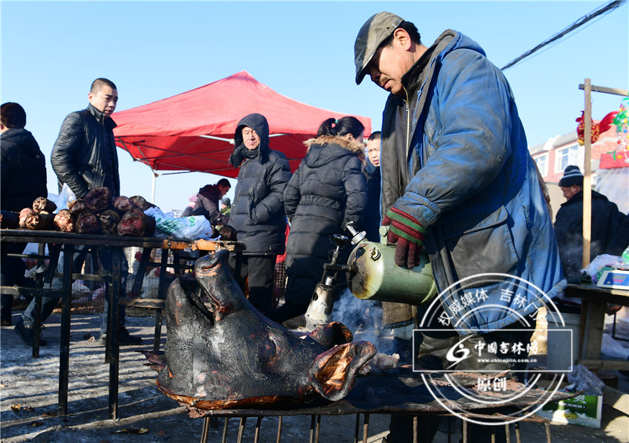 泉眼大集:喷灯烤猪头去毛,买回家省心。