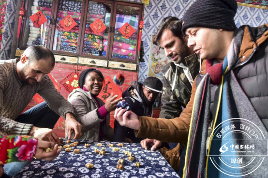 还有的外国友人坐在火炕上玩起了中国东北传统游戏嘎拉哈,在农家院主人简单的介绍下不一会就玩上手了,口袋翻飞迅速地抓起一把嘎拉哈,外国友人们玩的喜笑颜开笑声阵阵。