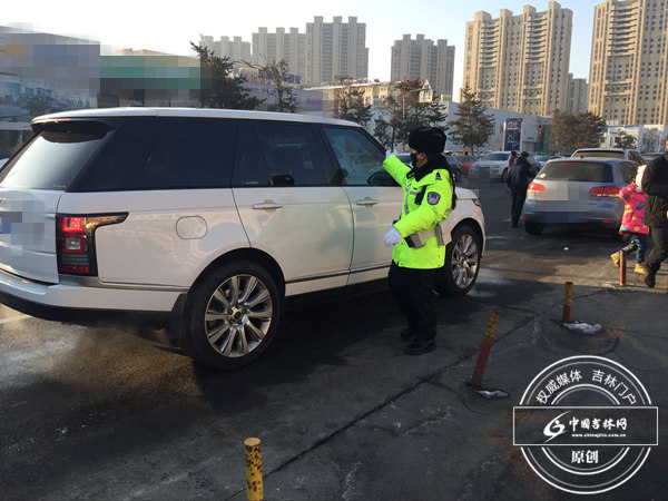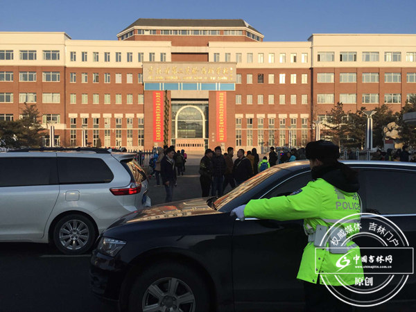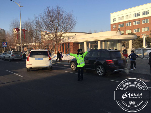 吉林省第二实验高新学校门口,交警正在指挥交通。