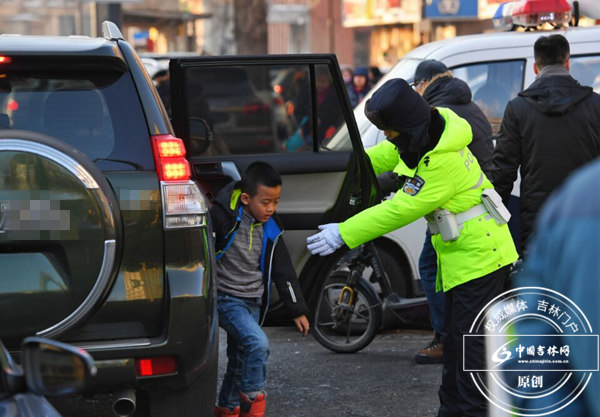 助学岗民警在路中心主动打开家长车门,手拉手接孩子下车。