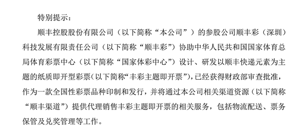 顺丰控股公告称,公司参股公司顺丰彩协助国家体彩中心设计、研发以顺丰快递元素为主题的纸质即开型彩票,已经获得财政部审查批准,作为一款全国性彩票品种印制和发行。