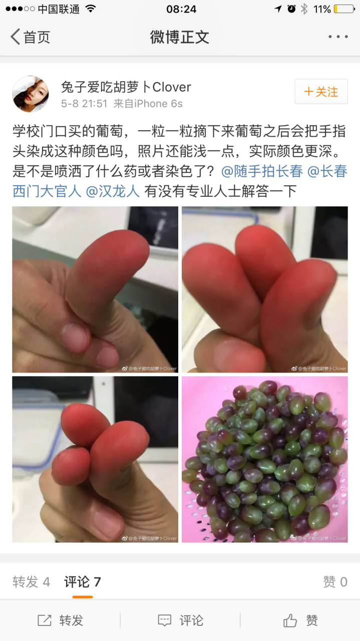 “在学校门口买了一串葡萄,一粒一粒地摘下来之后 ,发现手指被染成了紫红色。是不是被喷洒了什么药或者染色了?”