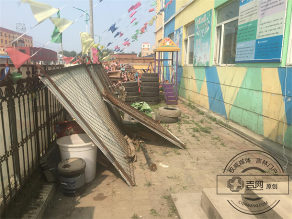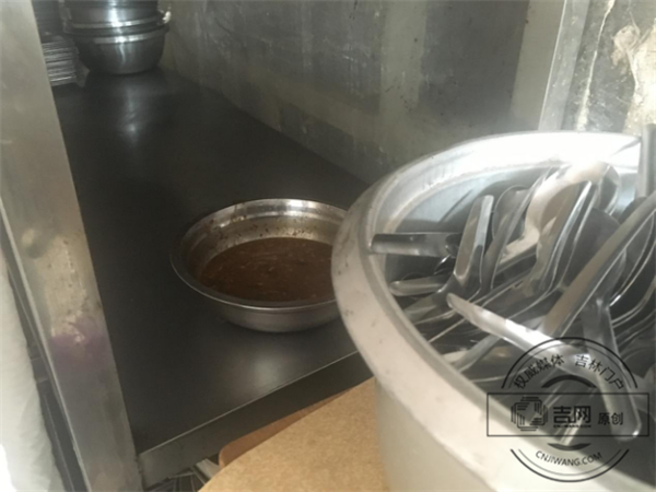 和执法人员一起走进幼儿园,吉网、吉刻APP记者首先发现,操场上一张桌子上凌乱的堆放着很多玩具,正在阳光下曝晒。幼儿园的教学楼稍显老旧,但厨房后场景却让人至皱眉头。正对门口的碗架子上放着一摞摞的小铁碗和一整盆小铁勺,小铁碗旁边还有一碗酱。一旁悬挂着的几个粘苍蝇纸,上面全是死苍蝇,散装豆油的瓶底也并没有QS标志。厨房的一角有一个液化气罐,连着灶具。厨房内并没有排烟设施,排烟仅靠一处排风扇。而在幼儿园的后门更加凌乱,吉网、吉刻APP记者发现了用过的废弃塑料瓶和用小推车堆积尚未处理的生活垃圾。