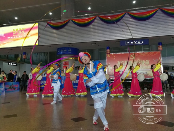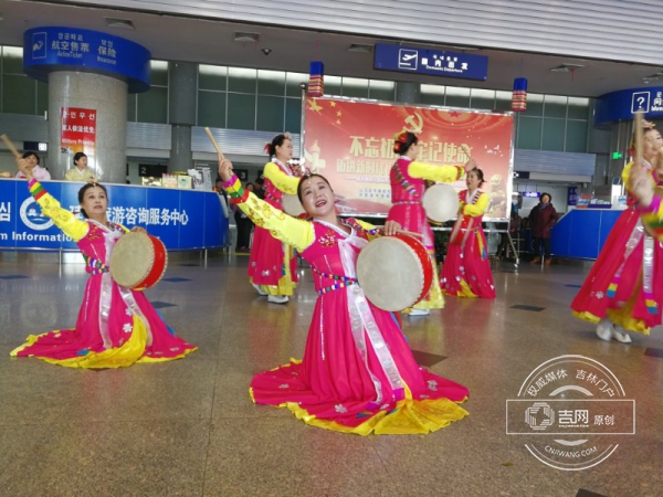 在登机牌办理区域,华丽的朝鲜族舞蹈、原滋原味朝鲜族打糕的现场制作、带有乡音的朝鲜族歌曲,深深吸引着每一名旅客。