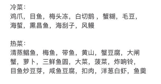 据媒体透露,“菜单上冷菜有10个左右,热菜约有20个。光大闸蟹就运了5箱过来,共200只!还有清蒸鲳鱼、梅鱼、带鱼、木鱼、白虾、鱼羹等热菜,海蜇、熏昌鱼、海瓜子等冷菜,菠菜、萝卜等新鲜时蔬只是个配角,简直是个海鲜宴啊!”