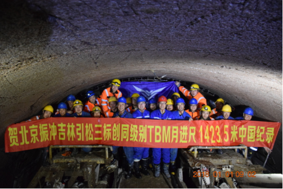 自2017年10月18日“吉林号”TBM完成转场开始第二阶段掘进,北京振冲屡创佳绩——2017年11月三标段“吉林号”敞开式TBM月进尺达1209米的好成绩;2017年12月再传捷报,TBM掘进月进尺达1423.5米,创国内同级别敞开式TBM最高月进尺纪录,仅次于美国TARP Chicago项目所创下的直径7~8米级别TBM月进尺世界纪录1482米。