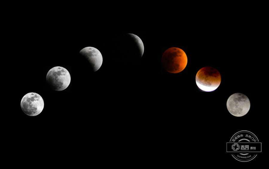 月全食分为五个阶段:初亏19时48分(月亮刚接触地球本影);食既20时51分(月亮恰好全部进入地球本影);食甚21时30分(月亮中心和地影中心相距最近);生光22时08分(月亮从地球本影冒出的刹那);复圆23时12分(月亮完全脱离地球本影)。整个月食,持续时间长达3小时24分钟(从初亏至复圆)。吉网、吉刻APP摄影记者:罗浩