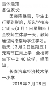 根据长春市部分家长们的爆料,吉网、吉刻APP记者进行梳理,下发“雪休通知”的学校约有17所学校:长春市二实验通达小学、银河一实验小学、87中、中海一实验小学、吉大附中英才学校、吉大附中高新慧谷、汽开区八校、汽车厂七校、汽开五校、汽车厂实验小学、苗圃小学、明珠小学、净月二实验、高新一实验、北安路二实验小学、汽车厂实验小学、中信三附小学校等多所学校,下发了“雪休通知”,因学生出行受到影响,3月1日星期四全校师生休息一天,教师通过网络指导学生学习。