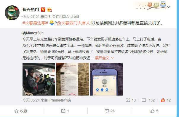 微博网友:“的姐”捡到手机归还时索要100元 “挺丢长春出租的脸的”